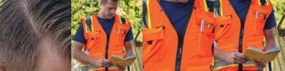 - Outside lower front pockets with flaps, left and right stake pockets, left and right elastic spray paint can pockets