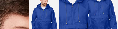 1.5 oz./yd² (US), 2.5 oz./L yd (CA) 100% polyester taffeta Water-resistant Center front coil zipper closure with shock cord at hood, and self-fabric chin guard Underarm eyelets for breathability and stretch binding at cuffs and hem for weather protection Snap closures on side Lower front pocket with zipper closure on top Packable jacket folds into its main pocket and converts to a wearable fanny pack design Bag design features heavyweight polyester woven webbed straps and center release plastic buckle Tear away label