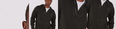 8 oz., stretch & sueded triblend terry; 51% rayon, 43% polyester, 6% elastine; 4-way stretch fabric withstriped loop back yarns; Advanced raglan sleeves with underarm gussets; Wrap back panel & front pouch pocket;